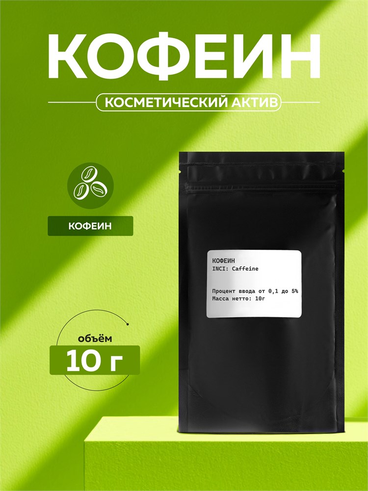 Свойства: производит заметный подтягивающий эффект, что позволяет использовать его не только в антицеллюлитных смесях, но и косметике для зрелой кожи. С его помощью Вы сможете подтянуть овал лица, избавиться от «мешков» под глазами. Кроме этого уместно использование кофеина в средствах по уходу за волосами, он стимулирует приток энергии к волосяной луковице, что способствует росту волос