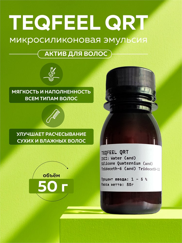 TEQFEEL QRT – революционная микросиликоновая эмульсия на основе кватернизированного аминофункционального силикона. TEQFEEL QRT обеспечивает множество преимуществ в широком спектре средств для ухода за волосами, а также в средствах для мытья. TEQFEEL QRT дает превосходную мягкость и наполненность всем типам волос. Обеспечивает великолепное сияние, улучшает расчесывание сухих и влажных волос, предупреждая их повреждения.