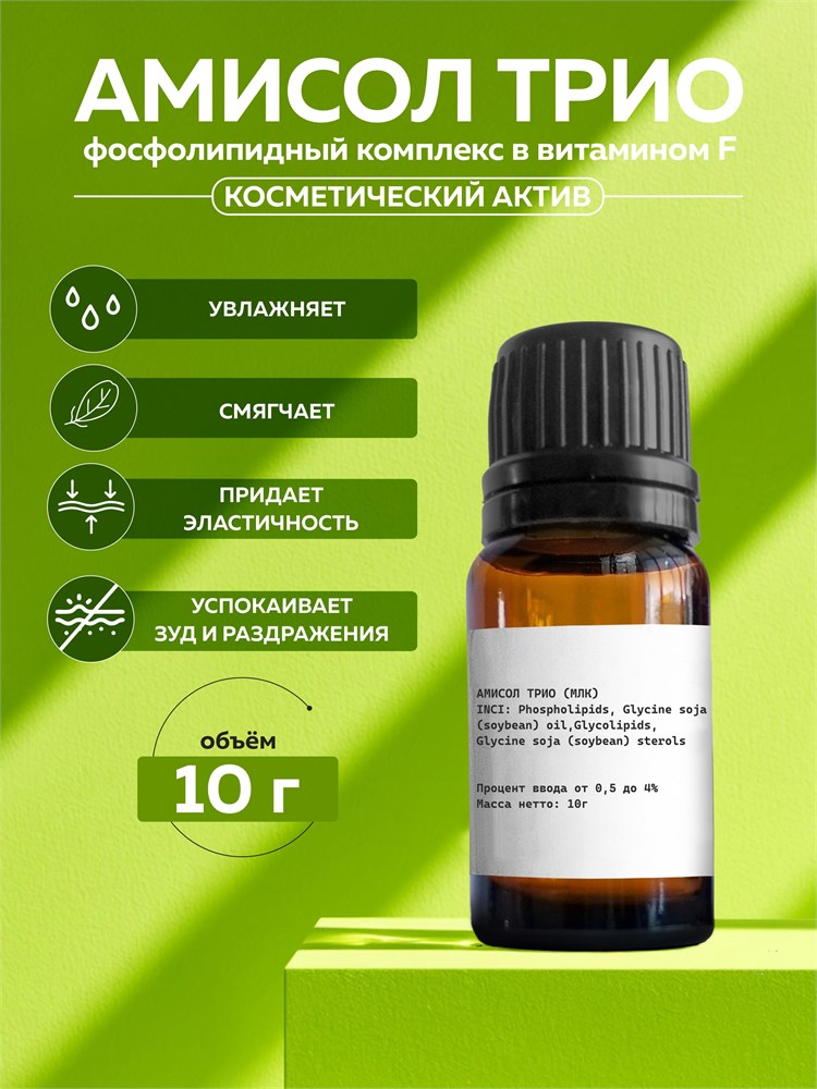 Новый компонент извлеченный из сои, Амисол Трио состоит из основных компонентов клеточных мембран, таких как фосфолипиды, гликолипиды, фитостеролы и витамин F (линолевая кислота). Сырье обладает защитными свойствами, обеспечивает питание и улучшает водный баланс волос и кожи. Благодаря родству между биолипидами и клеточными мембранами, Амисол Трио прилегает к поверхности волос и кожи и оставляет приятное и нежное ощущение, не жирное и не липкое, которое характеризуруется как «фосфолипидное прикасание». Таким образом вода сохраняется в волокнах волос или эпидермиса, повышая уровень увлажненности, предохраняя от пересушивания и неприятных ощущений во время и после мытья. Замутняющие свойства Амисол Трио позволяют разработку кремообразных моющих продуктов.
