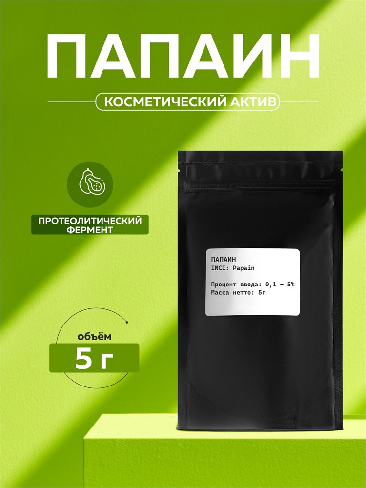 Папаин - полипептид, протеолитический растительный фермент. Натуральный папаин получают из сока дынного дерева или фракционированием сухого сока дынного дерева сульфатом аммония, хлористым натрием с последующей кристаллизацией. Папаин обладает рядом преимуществ: в отличии от кислотных и химических пилингов, его возможно применять в летнее время, на любом типе кожи. Папаин эффективно удаляет отмершие клетки, выравнивает рельеф кожи, стимулирует обмен клеток эпидермиса, не оказывая абразивного эффекта. Процедура пилинга папаином является высокоэффективной, комфортной и безопасной. Ферментативный пилинг особенно хорошо проявляет себя на возрастной коже, так как способствует уменьшению глубины морщин, усилению процессов регенерации и омоложению. За счёт активизации микроциркуляции улучшается и цвет лица. Папаин имеет очень широкий спектр применения в косметологии: подготавливает кожу к косметическим процедурам, очищает, усиливает микроциркуляцию, улучшает цвет лица, борется с врастанием волос после депиляции, уменьшает количество нежелательных волос, осветляет и выравнивает кожу.