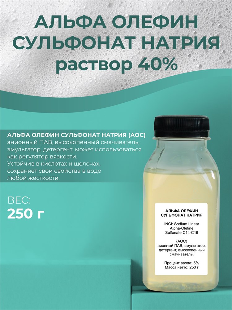 Альфа олефин сульфонат натрия (АОС) является анионным поверхностно-активным веществом (ПАВ), высокопенным смачивателем, эмульгатором, детергентом, может использоваться как регулятор вязкости. Устойчив в кислотах и щелочах, сохраняет свои свойства в воде любой жесткости.