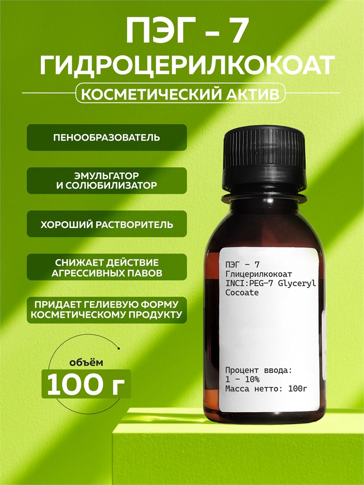 ПЭГ-7 Глицерил Кокоат — это неионогенное поверхностно-активное вещество и эмолент, получаемое путем этоксилирования глицерина и производных кокосового масла. Обладает мягким действием, хорошо распределяется по коже и волосам, улучшает ощущение от очищающих средств, снижает агрессивность анионных ПАВ.